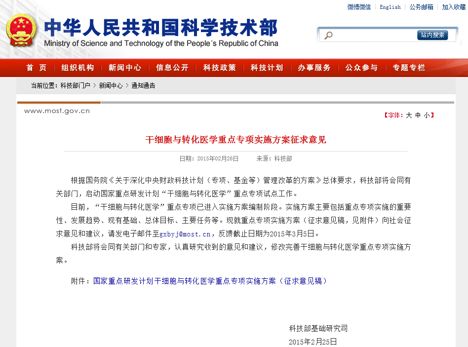 干細胞與轉(zhuǎn)化醫(yī)學重點專項實施方案征求意見 根據(jù)國務院《關(guān)于深化中央財政科技計劃(專項、基金等)管理改革的方案》總體要求,科技部將會同有關(guān)部門,啟動國家重點研發(fā)計劃“干細胞與轉(zhuǎn)化醫(yī)學”重點專項試點工作。 目前,“干細胞與轉(zhuǎn)化醫(yī)學”重點專項已進入…