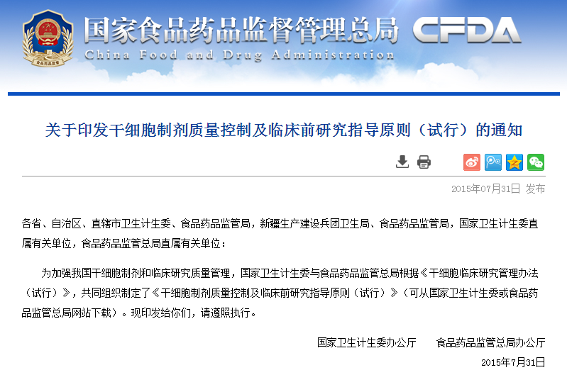 各省、自治區(qū)、直轄市衛(wèi)生計生委、食品藥品監(jiān)管局,新疆生產(chǎn)建設兵團衛(wèi)生局、食品藥品監(jiān)管局,國家衛(wèi)生計生委直屬有關(guān)單位,食品藥品監(jiān)管總局直屬有關(guān)單位:為加強我國干細胞制劑和臨床研究質(zhì)量管理,國家衛(wèi)生計生委與食品藥品監(jiān)管總局根據(jù)《干細胞臨床研究管…